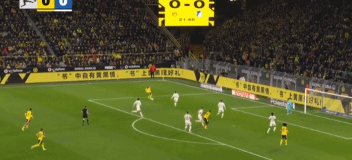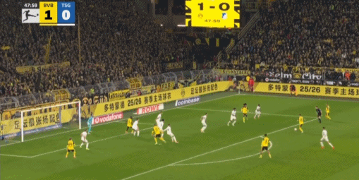 第43分钟,打破僵局,扬-科托助攻布兰特破门,多特1-0霍芬海姆